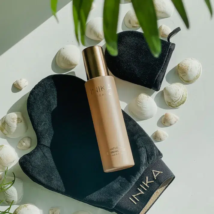 Breng de INIKA Organic Natural Tanning Mist aan op je Tanning Glove en verdeel gelijkmatig over de huid met zachte, ronddraaiende bewegingen. Werk in gedeeltes en begin met de grotere zones – romp, benen, armen, rug – voordat je de tanning aanbrengt op kleinere, lastigere plekken zoals handen, nek, voeten en andere vergeten zones.
