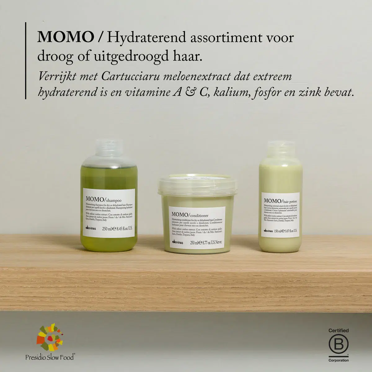 De MOMO Shampoo is speciaal ontwikkeld voor droog of uitgedroogd haar dat extra hydratatie en verzorging nodig heeft. Dankzij de zachte, gelachtige textuur reinigt deze shampoo het haar zorgvuldig en voorziet het tegelijkertijd van intensieve hydratatie. De shampoo transformeert bij gebruik in een romig schuim dat haar en hoofdhuid reinigt zonder uitdrogen. Door de diepe hydratatie voelt je haar na elke wasbeurt zacht, soepel en glanzend aan. Het haar behoudt zijn vitaliteit en glans — en is makkelijker doorkambaar.