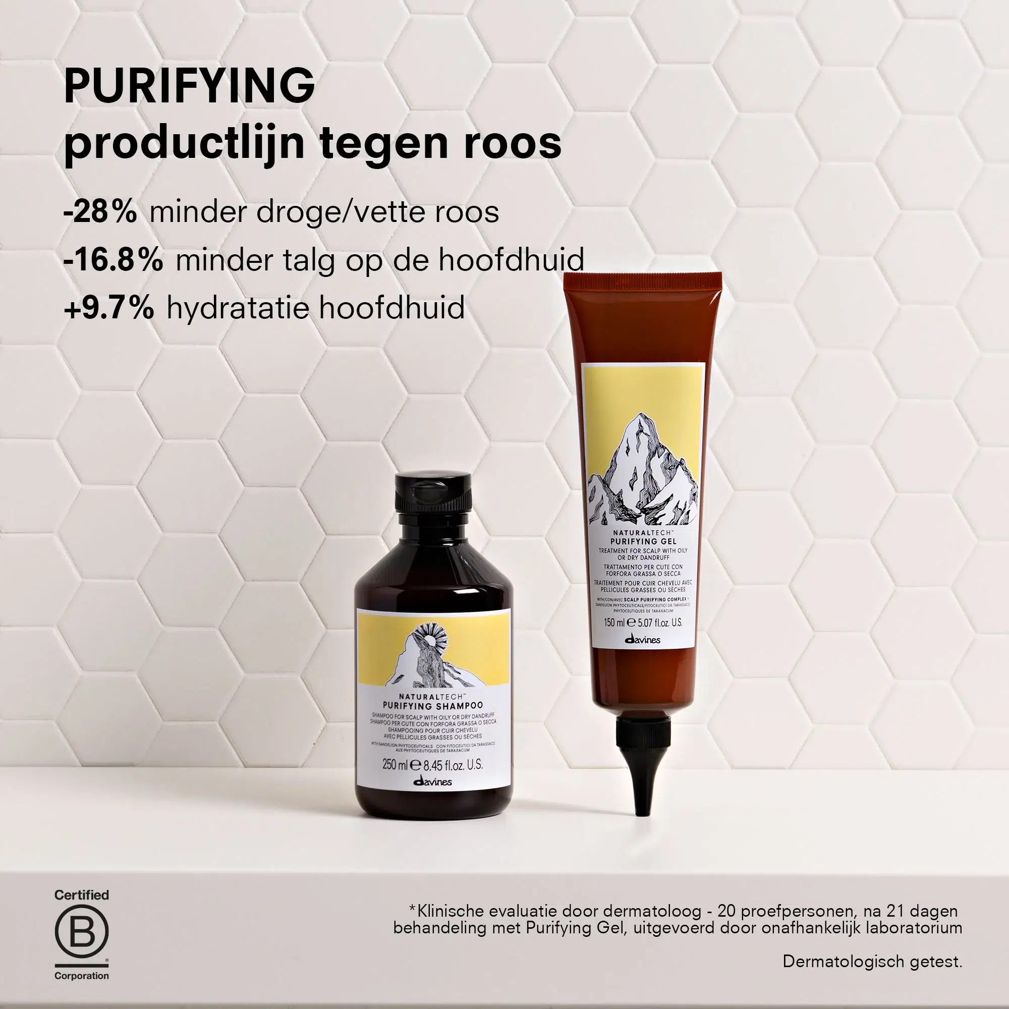 Davines Purifying Shampoo is een intensief zuiverende shampoo die speciaal ontwikkeld is om de hoofdhuid grondig te reinigen en roos — zowel droog als vet — aan te pakken. De shampoo verwijdert effectief schilfers en overtollig talg, terwijl hij de hoofdhuid kalmeert en herstelt. Tegelijkertijd zorgt hij voor een diepe reiniging zonder irritatie, zodat haar én hoofdhuid weer schoon, fris en gezond aanvoelen.